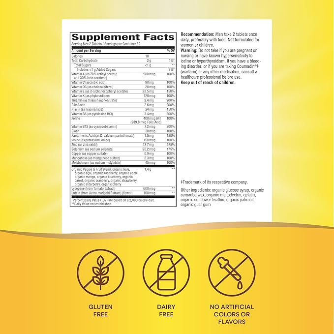- Multivitamin for men with 1 serving of vegetables and fruits.** Made with organic kale, acai, and raspberry.