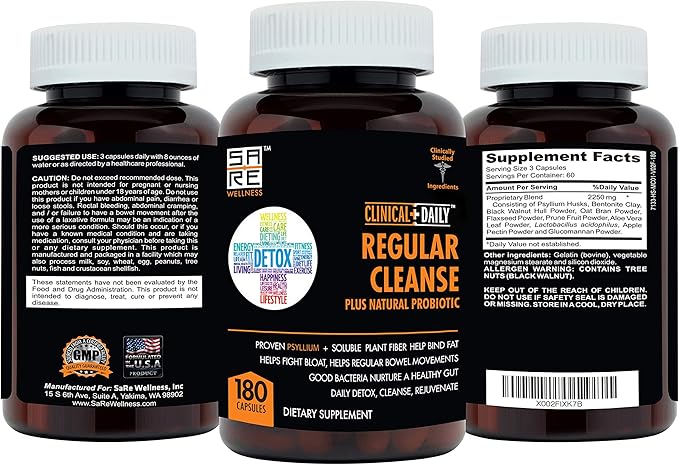 Clinical Daily Regular Cleanse Plus Natural Probiotic - Colon Cleanse & Gut Detox Supplement - Assists with Energy and Constipation Relief - Herbal Dietary Fiber Psyllium Husk Capsules - 180 Count
