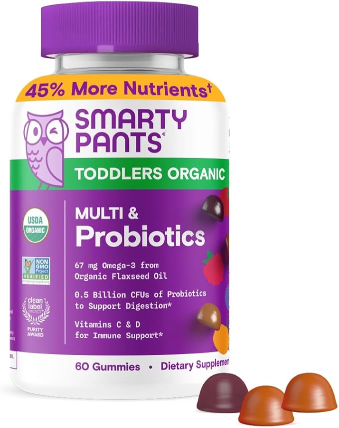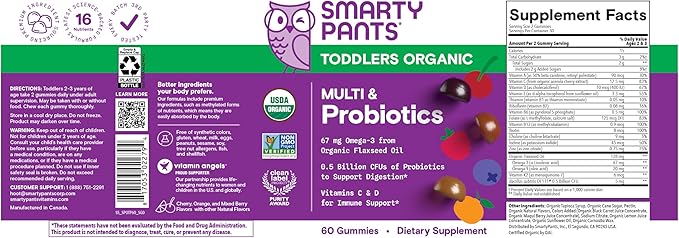 - PREMIUM SCIENCE-BACKED ORGANIC TODDLER GUMMIES: SmartyPants Organic Toddler Multi & Probiotics contains more nutrients than the leading kids multi brand’s top-selling item & helps fill nutrient gaps. Based on $ Sales, IRI InfoScan, & MULO, 05/2022-05/2023
