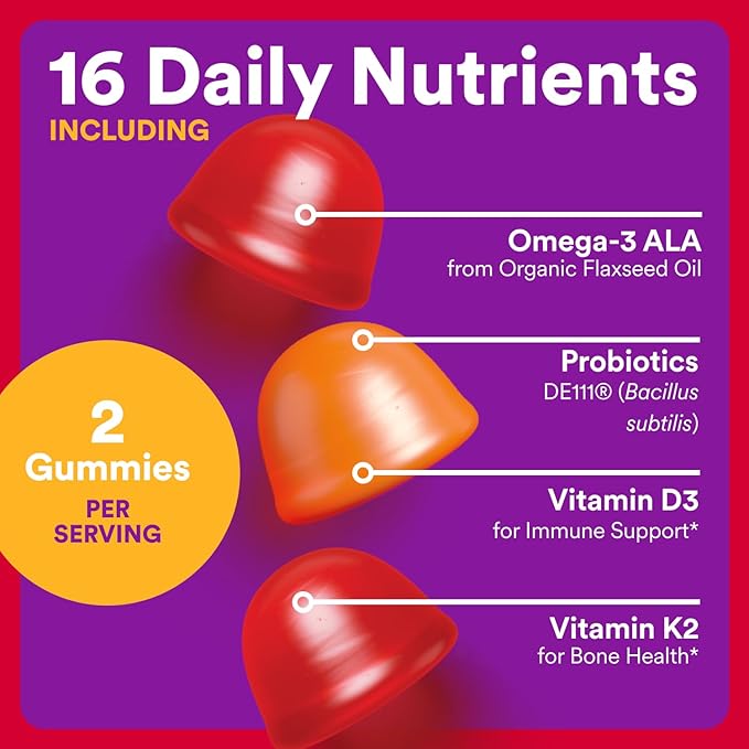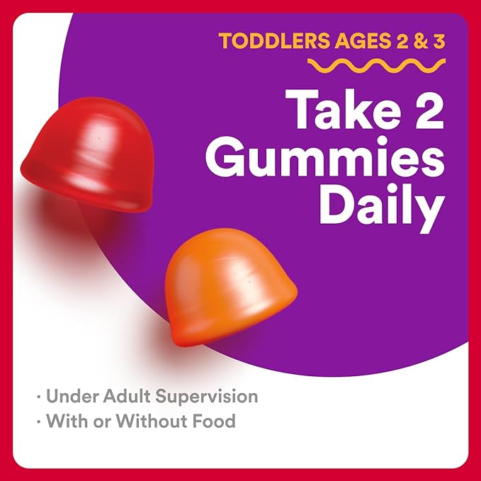 - DELICIOUS TASTE & KID-APPROVED: Cherry, Orange, and Mixed Berry Flavors with Other Natural Flavors. Toddlers 2-3 years of age take 2 gummies daily under adult supervision. May be taken with or without food. Chew each gummy thoroughly