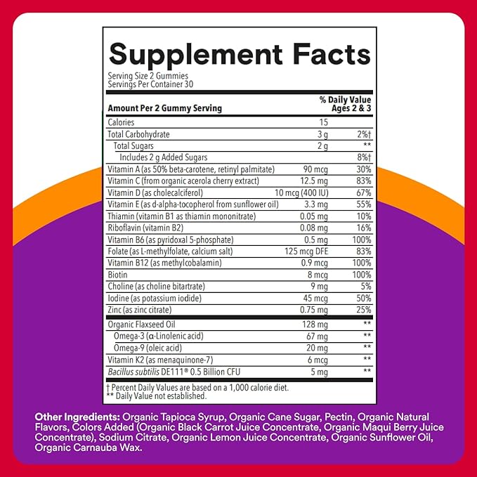SmartyPants Organic Toddler Multivitamin Gummies: Probiotics, Omega 3 (ALA), Vitamin D3, C, Vitamin B12, B6, A, K & Zinc, Beta Carotene, Gluten Free, Three Fruit Flavors, 60 Count (30 Day Supply)