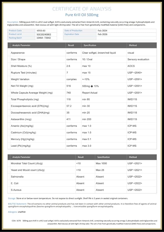 - Heavy Metal Tested – Every lot is tested to ensure that our Krill Oil exceeds United States safety standards for heavy metals and other contaminants.
