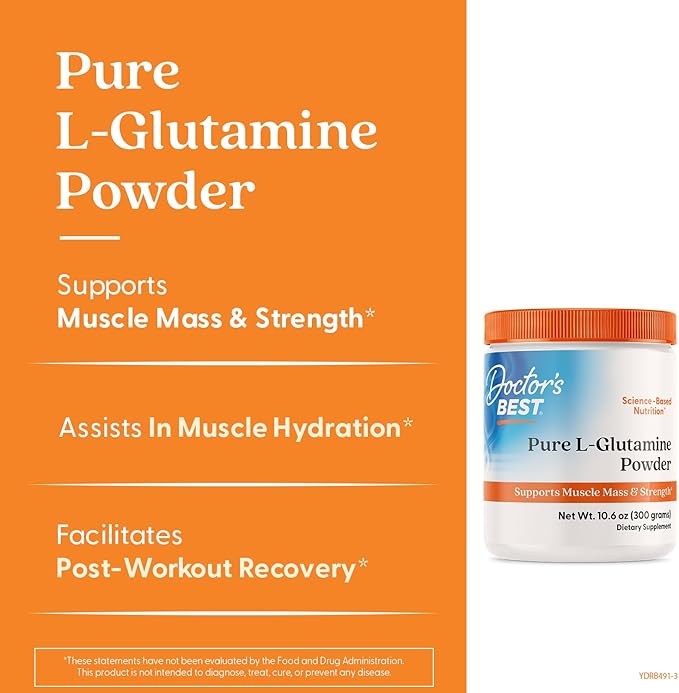 - DOCTOR’S BEST PURE L-GLUTAMINE POWDER – an amino acid that is a building block of protein. L-Glutamine is used to support muscle growth, skeletal muscles and athletic endurance. L-Glutamine is an amino acid that occurs naturally in our body. It is found abundantly in the muscle tissues and circulates freely in the blood.