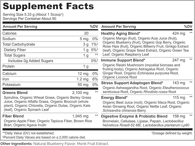 - BLEND OF 36 SUPERFOODS: Made with nutrient-packed whole foods, including raw greens like spirulina, barley grass, alfalfa, wheat grass, chlorella, kale, spinach, and broccoli, and fruits like mango, acai, blueberry, and goji berries.
