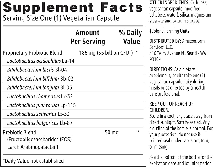 Amazon Basics Probiotic 35 Billion CFU, 8 Probiotic Strains with Prebiotic Blend, Supports Healthy Digestion, 30 Vegetarian Capsules, 1 Month Supply (Previously Solimo)