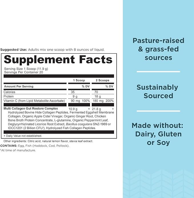 - BURSTING WITH BENEFITS - Every scoop of Gut Restore features hydrolyzed collagen types I, II, III, V, and X from Beef, Chicken, Fish and Eggshell Membrane. Our collagen powder is Non-GMO, grass fed and pasture-raised, made without hormones, cage free, cruelty free. Provides a wide variety of health benefits including supporting healthy hair, skin, nails and gut support. Includes shelf-stable Soil-Based Organism (SBO) probiotics, powerful prebiotics and specially selected Glutamine for gut health