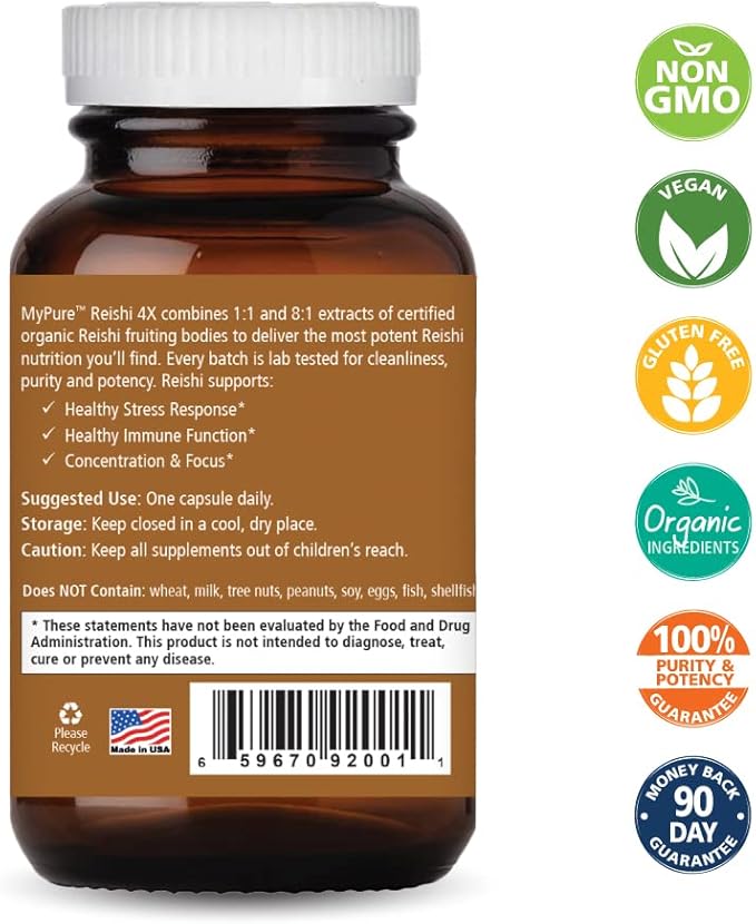 PURE ESSENCE LABS MyPure Reishi 4X Organic Mushrooms Supplement - 100% Real Mushroom Extract for Immune Support, Stress Relief, Build Energy (30 Capsules)