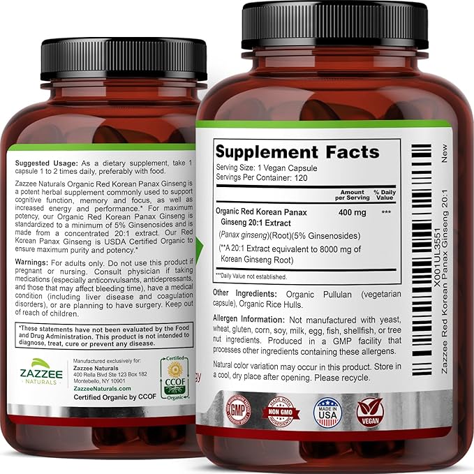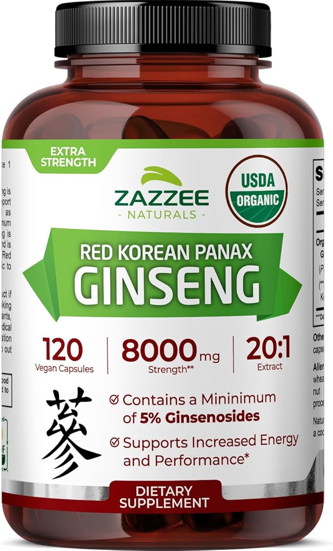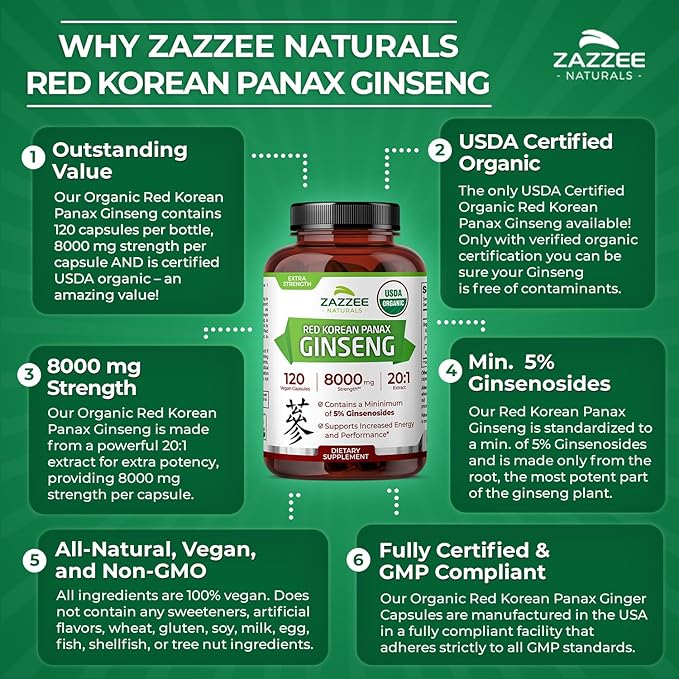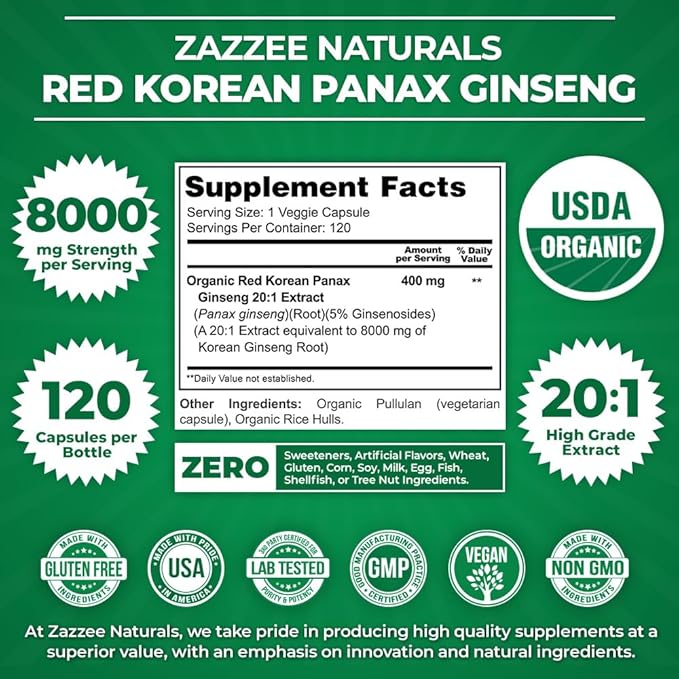 - USDA CERTIFIED ORGANIC: Any Red Korean Panax Ginseng that is not CERTIFIED organic can be contaminated and toxic to your body. With Zazzee Naturals USDA Certified Organic Red Korean Panax Ginseng, you can be sure your Ginseng is organic, all-natural, vegan, and non-GMO. More, while other competing products use various chemicals as fillers, binders, and excipients, our Organic Red Korean Panax Ginseng instead contains only all-natural, organic stabilizers.