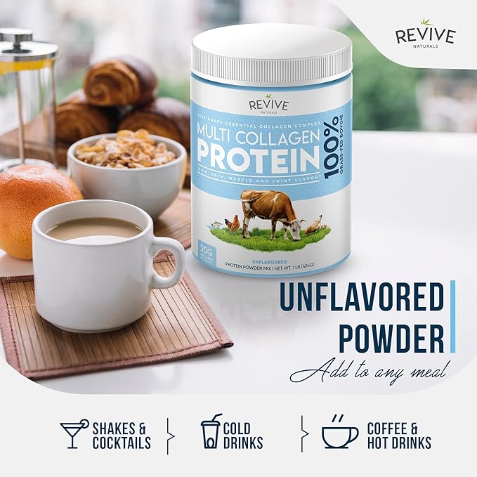 Revive Naturals Multi Collagen Hydrolyzed Protein Powder (16oz) - Types I, II, III, V & X - Grass Fed Bovine, Wild Caught Marine, Free Roaming Chicken & Eggshell Collagen Peptides,