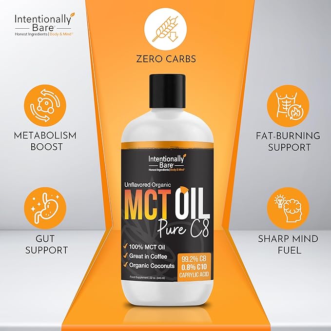 Intentionally Bare Pure C8 MCT Oil Organic - Brain Octane C8 MCT Oil for Keto Paleo & Vegan Diet - Unflavored MCT Oil C8 for Bulletproof Coffee Shakes & Salads - 100% Pure MCT Oil 32 oz