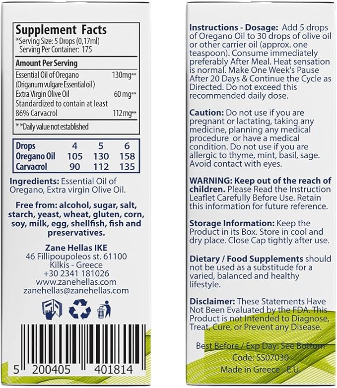 - ZANE HELLAS GREEK BLENDED ESSENTIAL OIL OF OREGANO 70% OREGANO OIL -30% GREEK VIRGIN OLIVE OIL - Zane Hellas Blended Oregano Oil - 70% Superior Oil From the Best Well Known Variety and Indigenous to the Greece Region Oregano (Origanum vulgare Heracleoticum) - Produced via Steam Distillation- With 86% Min Carvacrol And Less than <2% Thymol - Blended With 30% Greek Extra Virgin Olive Oil -112 mg Carvacrol per Serving.