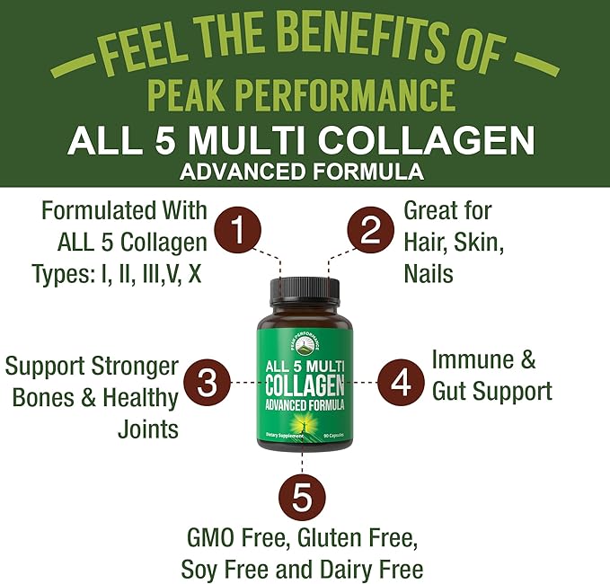 - Most collagen supplements rely on just a single source of collagen. Until now… The Peak Performance All 5 Multi Collagen Is The Ultimate Blend of all 5 collagen types: I, II, III,V, X. With Hydrolyzed Bovine Collagen Peptides, Bovine Bone Broth Hydrolyzed Protein, Hydrolyzed Fish / Marine Collagen, Chicken Bone Broth Collagen Concentrate and Eggshell Membrane Collagen!