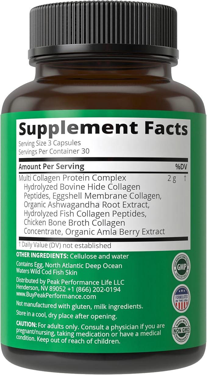 Peak Performance All 5 Multi-Collagen Capsules 90 Pills of Grass Fed Peptides Protein. with All 5 Collagen Types I, II, III,V, X. Grass Fed Beef, Fish, Chicken, Bone Broth Supplement