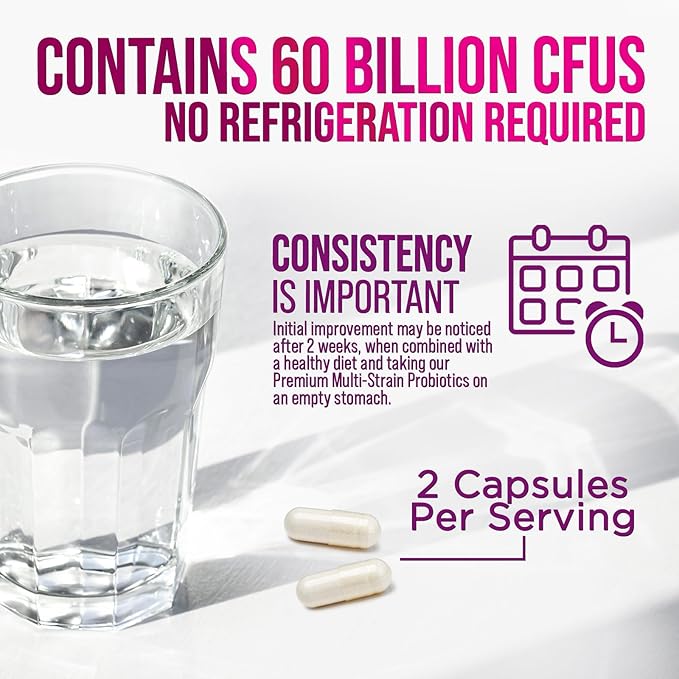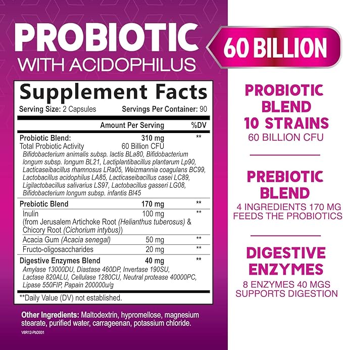 - Probiotics for Digestive Health: 60 Billion CFU, potent formula blended with lactobacillus acidophilus, plantarum, and paracasei with bifidobacterium lactis to target gut flora, ph balance, and support digestive health
