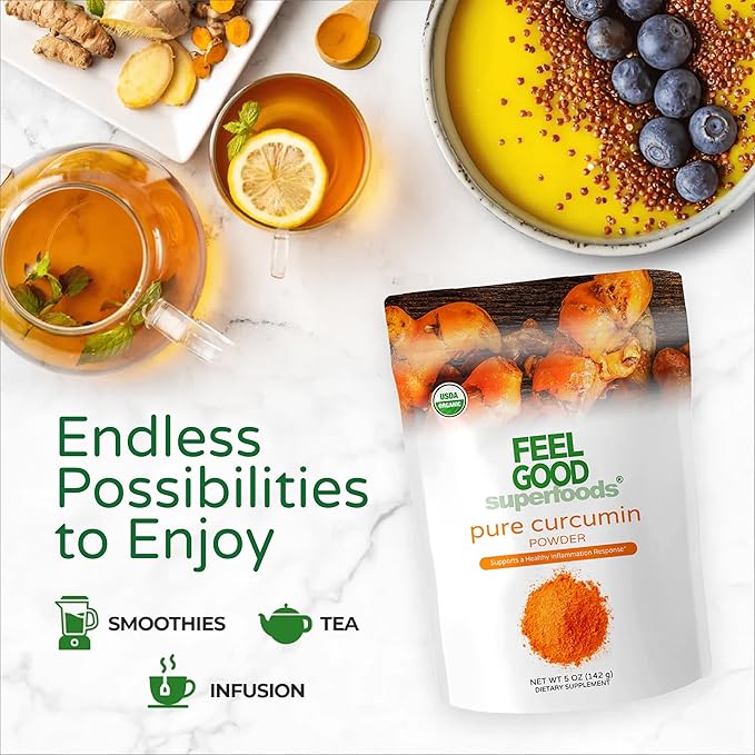 Feelgood Organic Superfoods Pure Curcumin Powder, Organic, Non-GMO, Vegan from Bulk Ground Turmeric Root from India, Curcuma Longa Joint Supplement, 5 oz