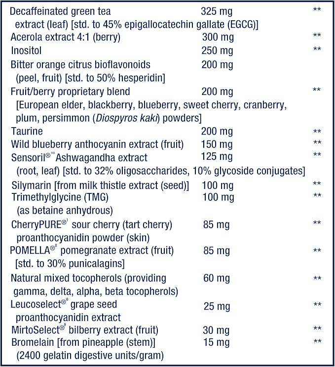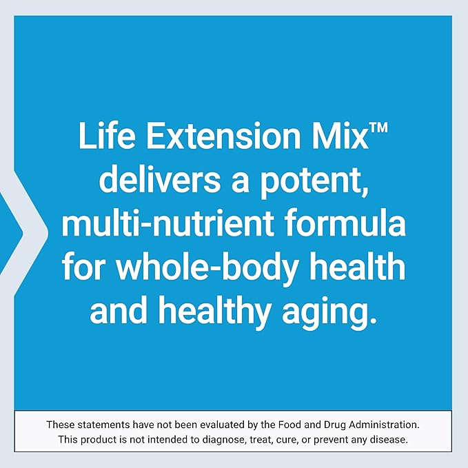 - Fruit & veggie extracts – Each dose of Life Extension Mix delivers dozens of antioxidant extracts such as blueberry, pomegranate, maqui berry and green tea, along with cellular health-promoting broccoli.
