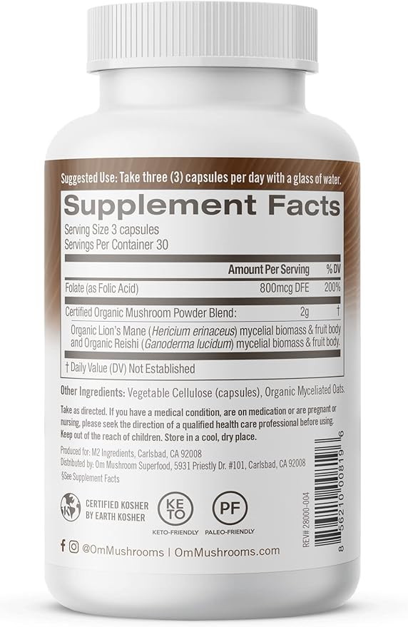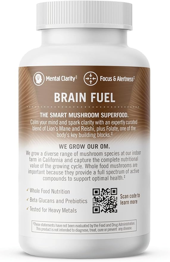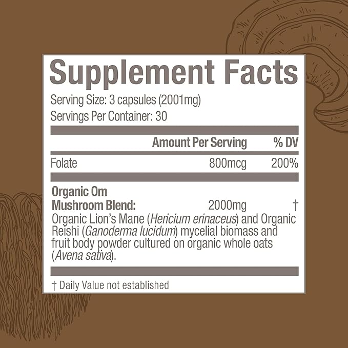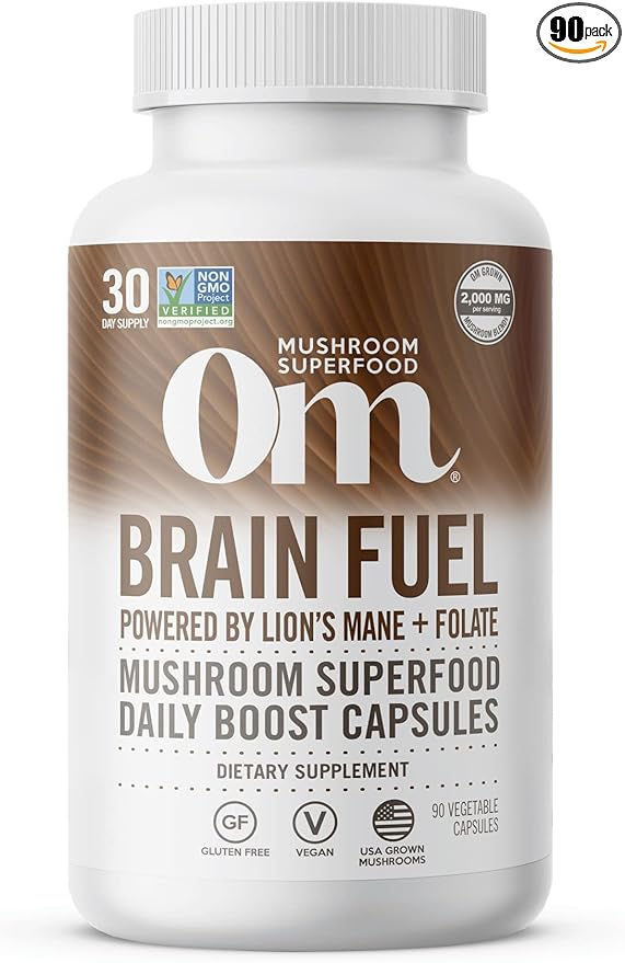 OM MUSHROOM SUPERFOOD Brain Fuel Mushroom Powder Capsules Superfood Supplement, 90 Count, 30 Days, Lion's Mane, Reishi Blend Plus Folate, Mental Clarity, Mushroom Supplement