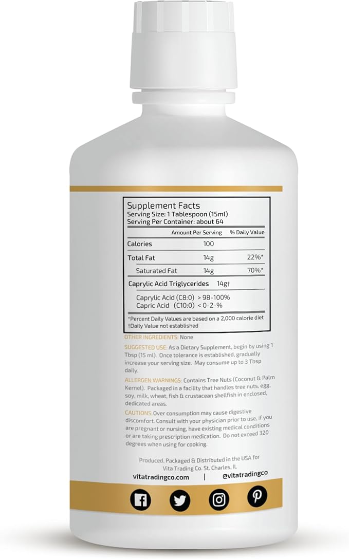 VTC VitaTradingCo. 100% Pure C8 MCT Oil | 3X Distilled Caprylic Acid | Healthy Fat for Clean Energy | Sustainably Sourced | Non-GMO, Paleo, Keto | 32oz, 64 Servings (Unflavored)