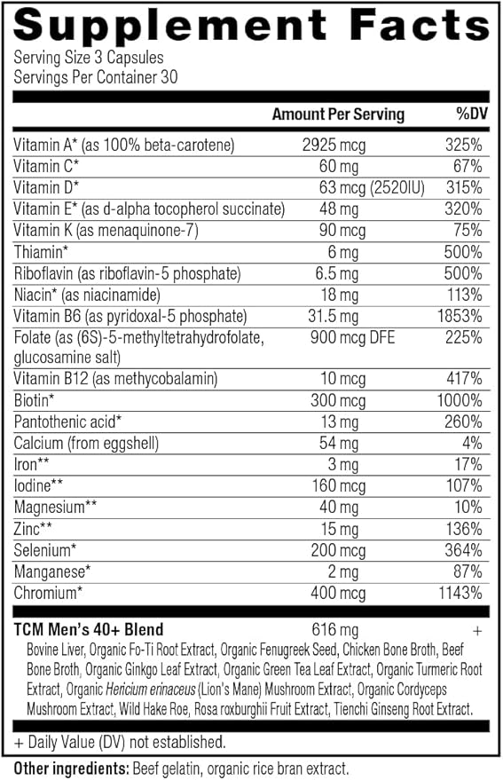 - TCM MEN’S 40+ BLEND- Our Traditional Chinese Method blend is based off of a Chinese tradition using herbs that has been around for more than 2,000 years.This blend features Organic Ginkgo Leaf and Lion’s Mane. We also added Bovine liver and Wild Hake Roe, which are considered some of the most nutrient-dense foods on this planet, as well as collagen-rich bone broth and Fenugreek.