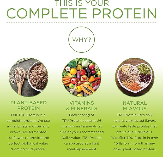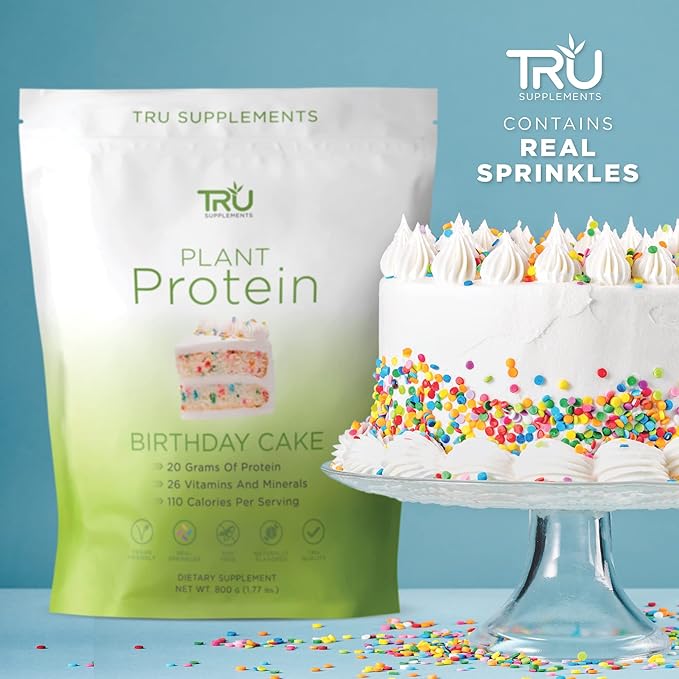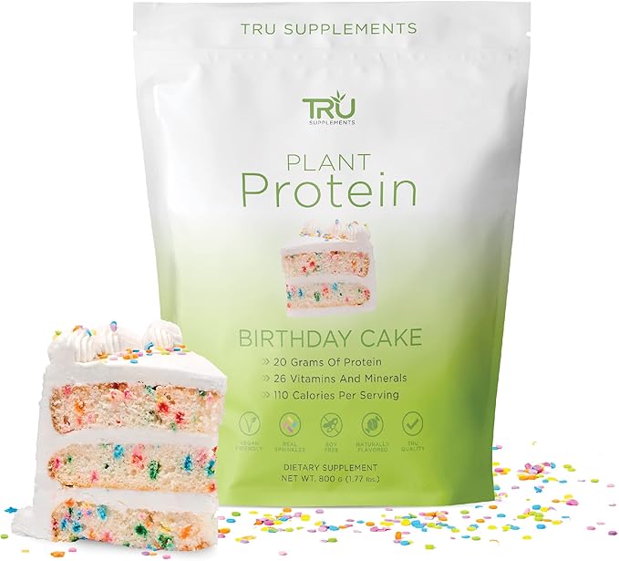 TRU Supplements Plant Based Protein Powder, BCAA, EAA, 20g Vegan Brown Rice & Pea Protein, 100 Calories, 27 Vitamins, No Artificial Flavors 25 Servings (Birthday Cake)