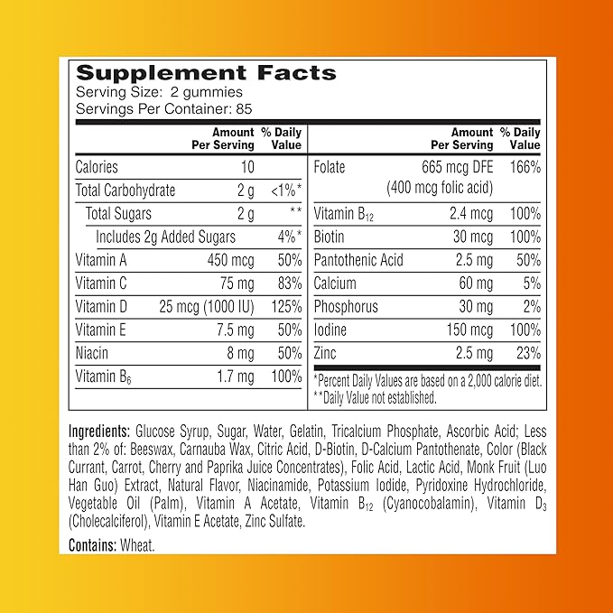 - Contains key nutrients like Vitamins A, B12, B6 , C, D, E, Folic Acid, Biotin,1 Iodine, Zinc, and Calcium