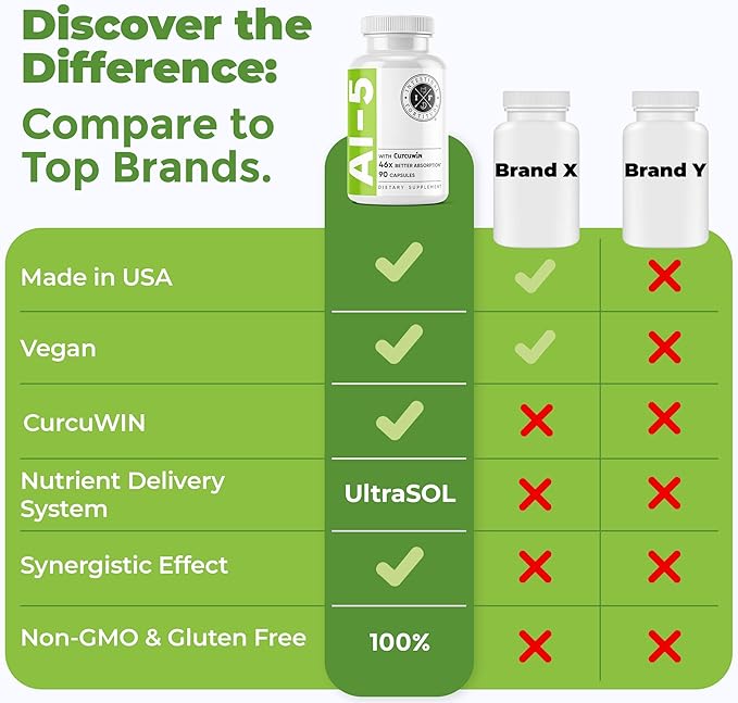 - CURCUWIN: Our AI-5 supplement features CurcuWIN, known for its remarkable 46x higher absorption of curcuminoids compared to standard curcumin which helps with optimal bioavailability & effectiveness.