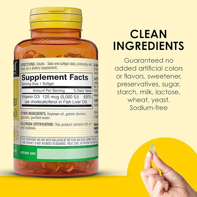 MASON NATURAL Vitamin D3 125 mcg (5000 IU) - Supports Overall Health, Strengthens Bones and Muscles, from Fish Liver Oil, 50 Softgels