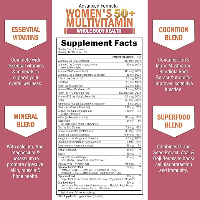 Daily Multivitamin for Women 50 & Over – Memory Support Supplement – Promotes Stress Reduction & Healthy Immune Response – Women's Multivitamin Supplement Designed for Stomach Comfort - 60 Capsules
