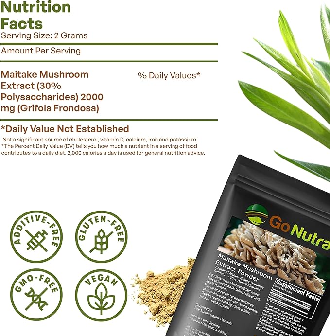- No Harmful Additives - Discover the purest source of nutrition — Go Nutra’s Maitake mushroom. This mushroom superfood is vegan-friendly and made without gluten, GMOs, fillers, or additives — only robust nutrients your body deserves. No added ingredients or grains or fillers - 100% Mushroom from whole fruiting bodies.