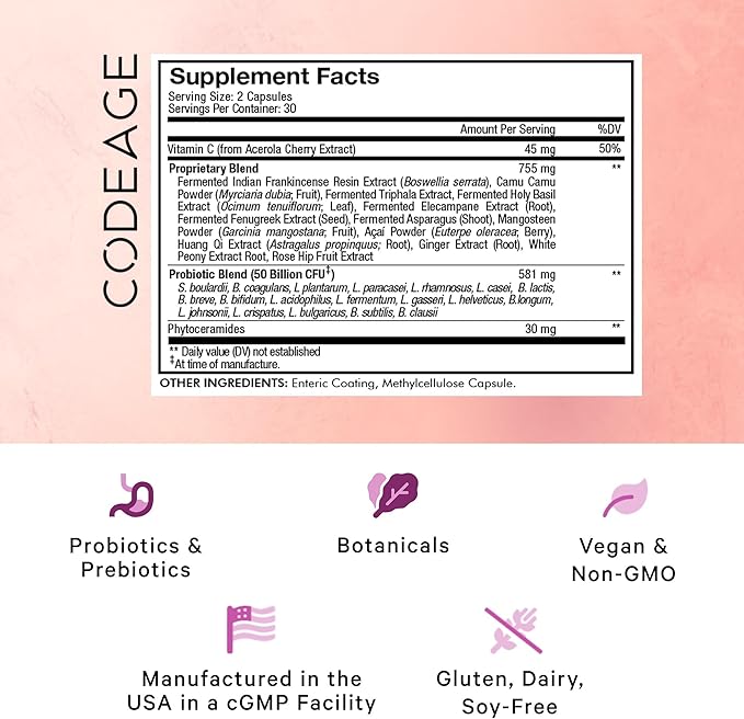 - Premium Probiotic Blend: Codeage Skin Probiotic supplement offers an all-in-one premium probiotic supplement. This advanced formula features 19 strains of probiotics with 50 Billion CFUs** per serving. This probiotics and prebiotics formula also provides phytoceramides and botanical herbs rooted in Ayurveda.