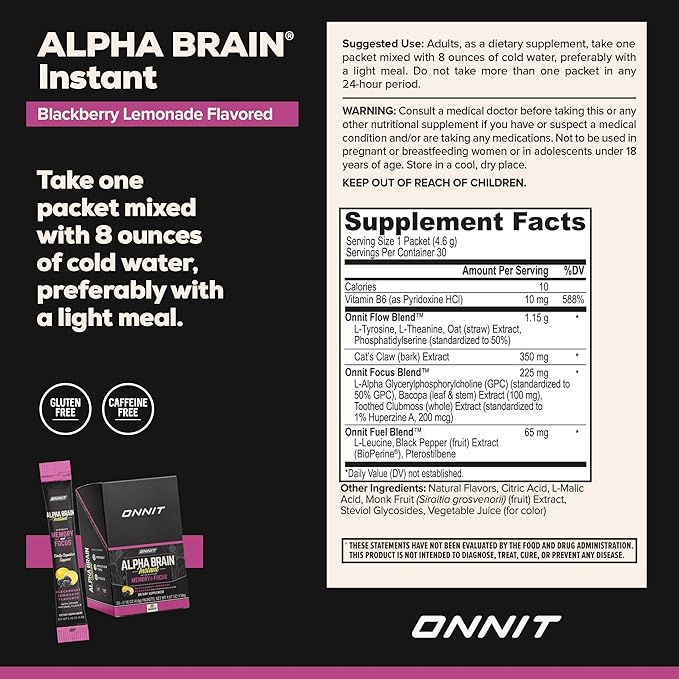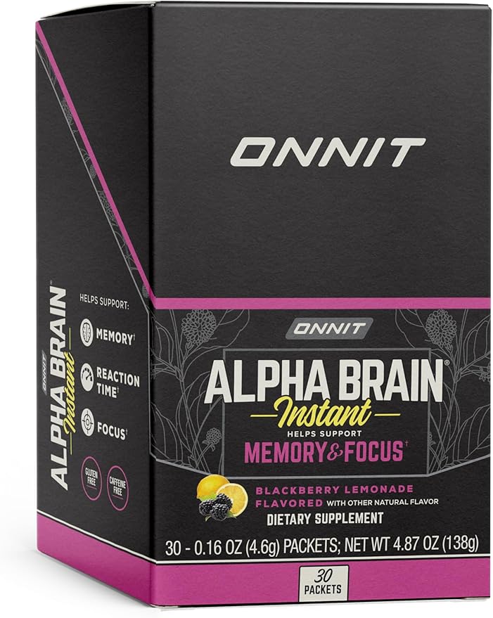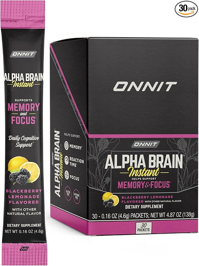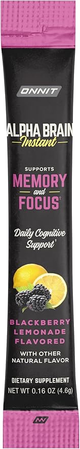 ONNIT Alpha Brain Instant Cognitive Support Drink Mix, BlackBerry Lemonade Flavor, Nootropic Supplement for Focus, Memory, and Clarity, 0.13 oz Packets, 30 Count