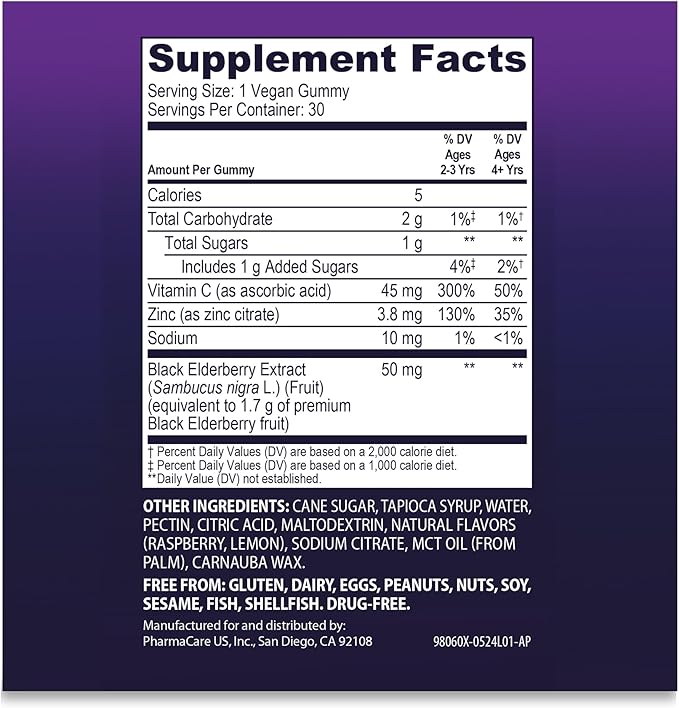 - COMPREHENSIVE FORMULA - Our Elderberry Gummies with Zinc and Vitamin C for Kids are free from gluten and artificial flavors. Made without dairy, soy, wheat, or nuts. Vegan and vegetarian friendly