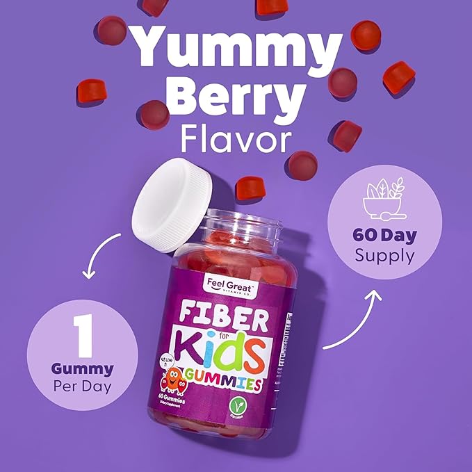 The Feel Great Vitamin Company Fiber Gummies for Kids for Digestive Support | Constipation Relief for Kids | Fruity Flavored Chewable Fiber Gummies | Vegetarian Supplements | 60 Day Supply
