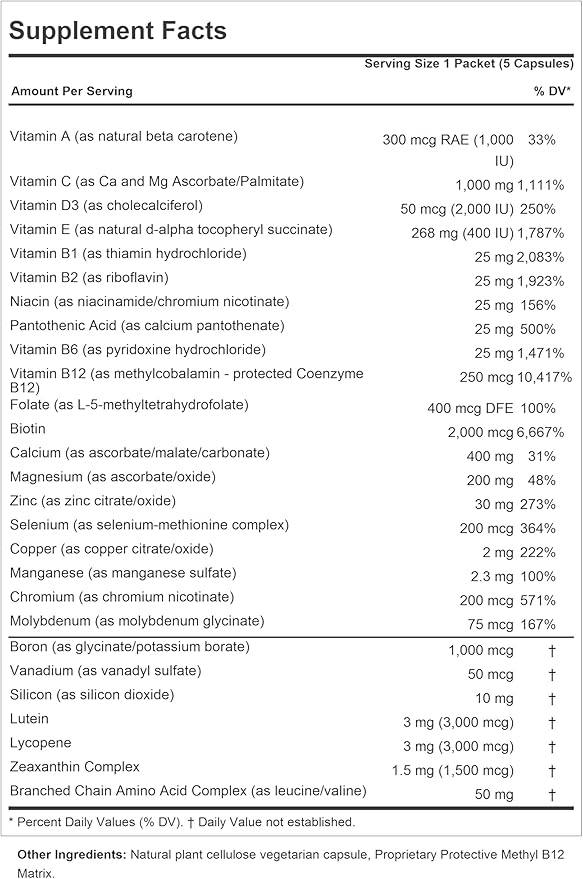 - Superior pure bio-active ingredients - Provides high potencies of all essential vitamins, minerals and carotenoids, including Vitamin A, vitamin C, Vitamin D3, Vitamin E, B-complex vitamins, Calcium, Magnesium, Zinc, Selenium, Copper, Manganese, Chromium, Molybdenum, Boron, Vanadium, Silicon, Lutein, Lycopene, Zeaxanthin and Branched Chain Amino Acid. Contains no Milk / Dairy-Free, Gluten-Free; no Additives or Common Allergens of Any Kind.