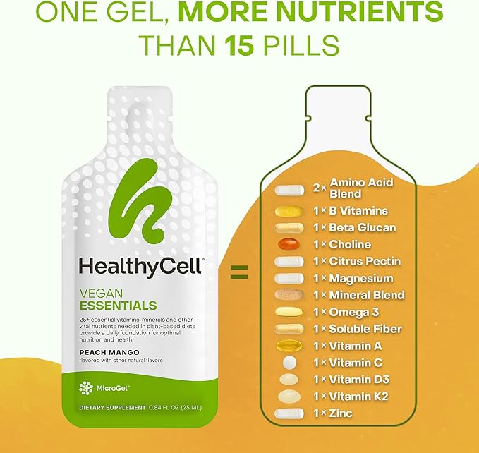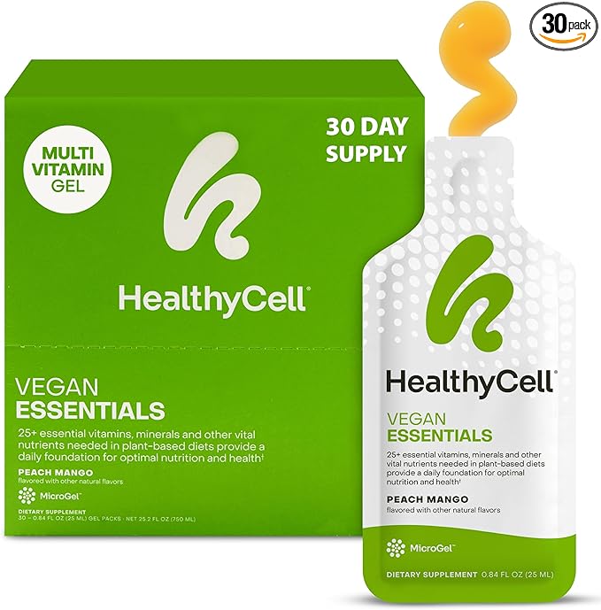- Complete Plant-Based Nutrient Support: HealthyCell Vegan Essentials is a daily multivitamin for men and women that offers a broad spectrum of vitamins, minerals, and other vital nutrients that plant-based diets often lack. Everything you need to help fill nutritional gaps and support a healthy immune system in a tasty, peach mango-flavored MicroGel.