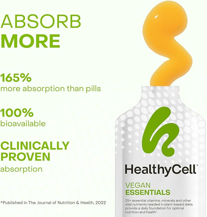 HealthyCell Vegan Essentials Daily Liquid Multivitamin Supplement with Iron and Choline – 25+ Essential Vitamins, Minerals & Nutrients for Brain & Heart Health, Immune Support & Energy - 30 Gel Packs