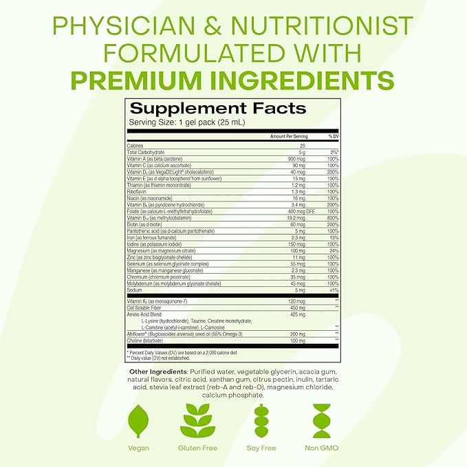 - On-the-Go Vegan Wellness & Daily Nutrition Support: Compact and convenient, these gel packs are easy to take on the go for daily vegan nutrition to help support energy, immunity, and overall wellness no matter where you are.