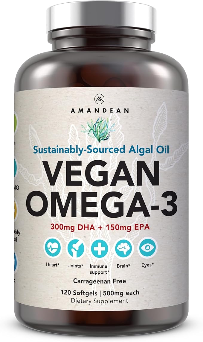 AMANDEAN Vegan Omega 3 Supplement. Premium Fish Oil Alternative. Algae DHA & EPA. Carrageenan Free Softgels. Algal Essential Fatty Acids. Plant Based Heart, Brain, Eye, Skin, Immune Support. (120ct)