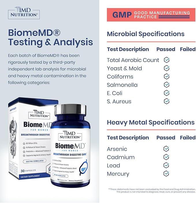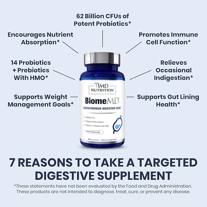- Microbiome Balance: BiomeMD restores the right probiotic bacteria to your gut’s microbiome while nourishing them with powerful prebiotics they need to thrive.* This helps restore and maintain a strong balance of “good” bacteria in the gut for digestive and immune health.*