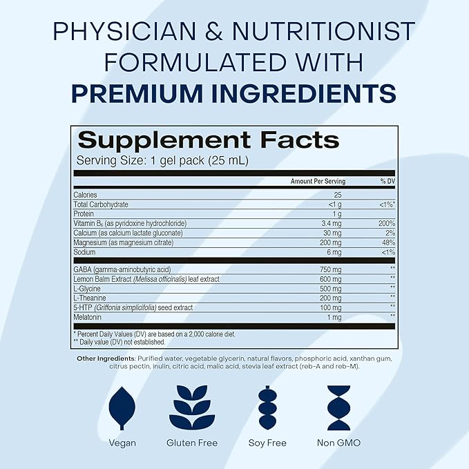 • All-in-One Formula Replaces 10 Pills: The future of vitamins is pill free. This physician and nutritionist formulated gel pack helps promote deep, restful sleep with over 2,384 mg of melatonin, L-theanine, GABA, magnesium, 5-HTP and other essential nutrients to help you relax, fall asleep, stay asleep, and wake up refreshed.