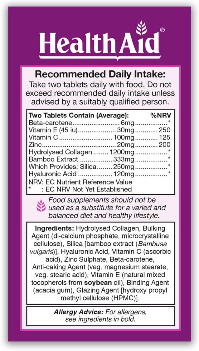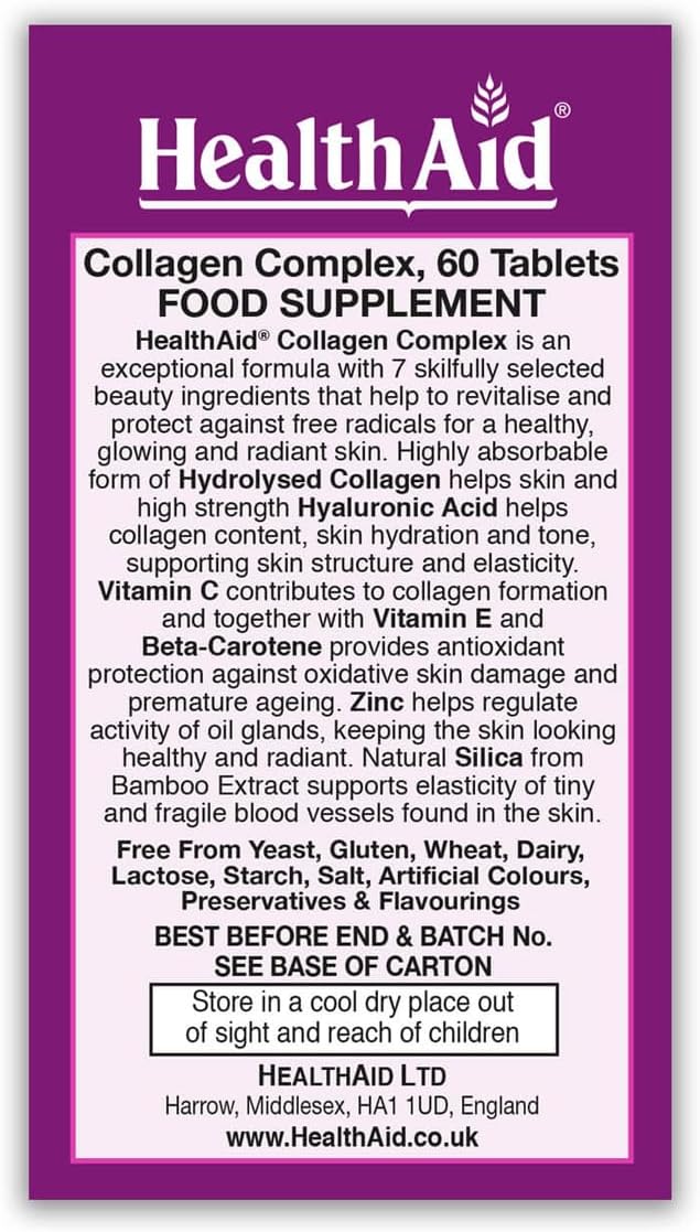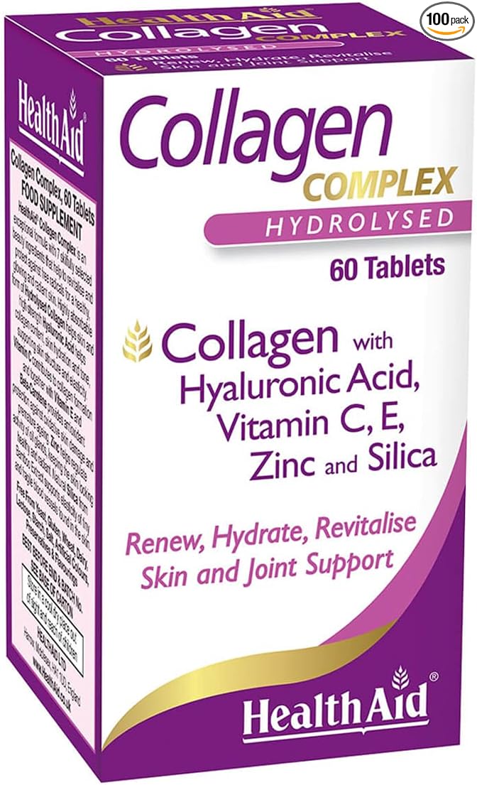 Collagen Complex, Marine Collagen and Hyaluronic Acid, Vitamin C, E, and Zinc, 2 Tablets Daily, Healthaid America