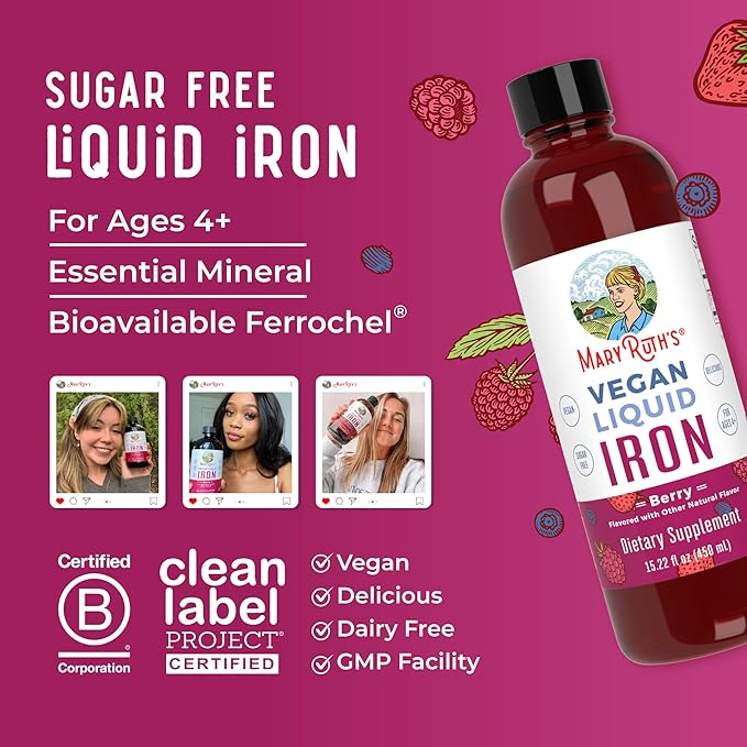 - For Most Lifestyles: MaryRuth's liquid iron supplement for kids and adults is Non-GMO, Vegan, No Artificial Colors. Liquid iron made in a GMP (Good Manufacturing Practice) Facility. Dairy Free, Nut Free, Gluten Free, Soy Free, Sugar Free. Clean Label Project Certified. B Corp Certified.