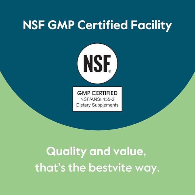 - NSF GMP CERTIFIED FACILITY: Bestvite’s facility is NSF/ANSI 455-2 Dietary Supplements Good Manufacturing Practice (GMP) certified. Earning GMP certification from NSF verifies that a manufacturing facility has the proper methods, equipment, facilities, and controls in place to produce dietary supplement products.