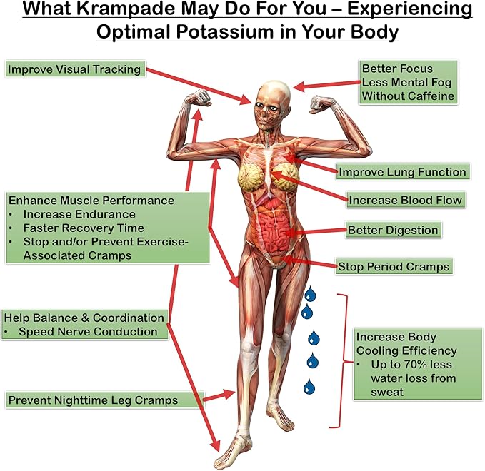- INCREASED ATHLETIC PERFORMANCE - Potassium increases blood flow enhancing endurance and speeding recovery