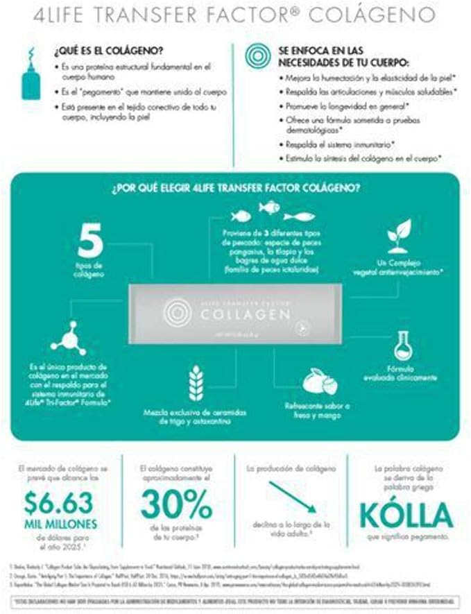 - Formula that features five types of collagen; 4Life Transfer Factor; vitamins A, C, and E; biotin; and our Age-Defying Plant Complex