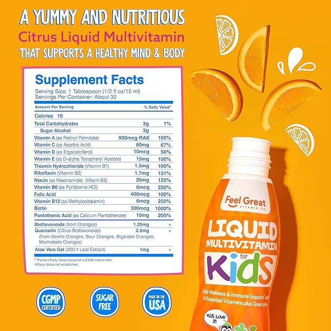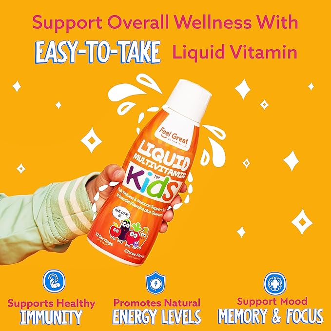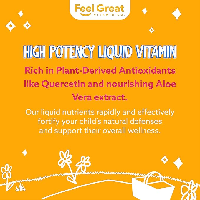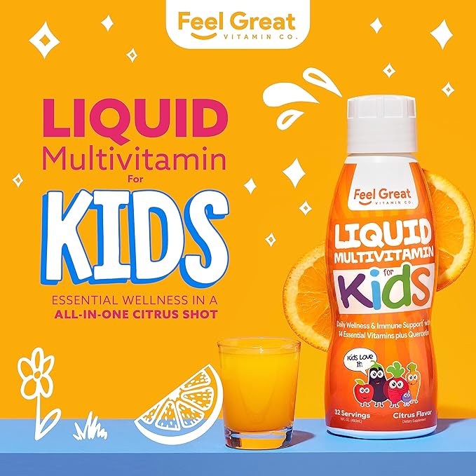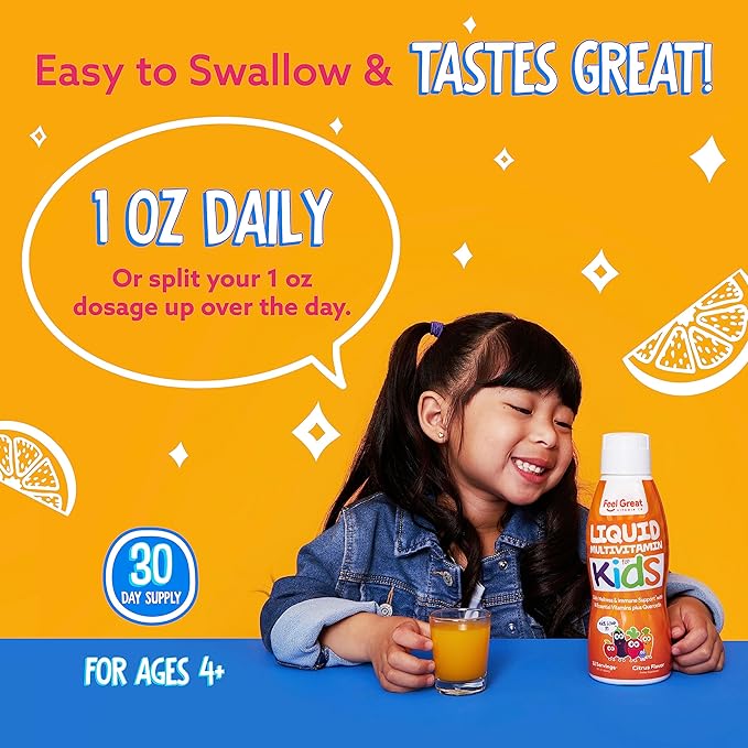 Feel Great Liquid Multivitamin for Kids | Orange Flavored Vegetarian & Sugar Free Kids Liquid Vitamin | Essential Kids Vitamins & Immune Support for Kids | 30 Day Supply
