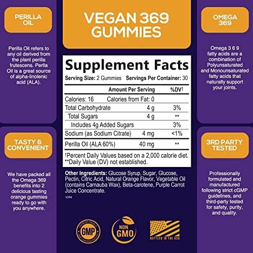 - High Quality & Vegan: Our Omega 3 Gummies are 100% plant based, made from healthy Perilla Oil; All the omega 369 benefits packed into convenient and tasty gummies