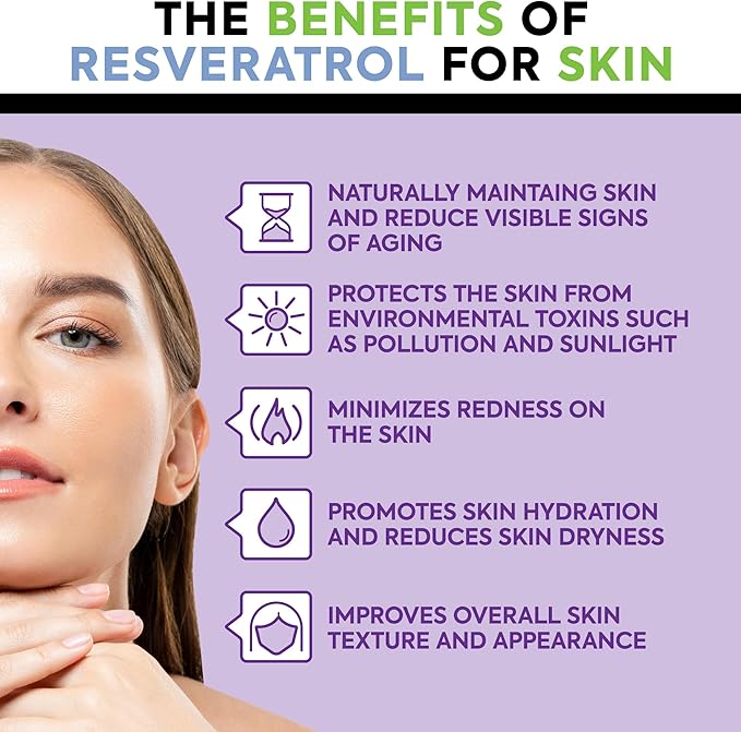- ANTI-AGING, ANTI-OXIDANT Supplement to make you Look and Feel Younger: Every day, environmental toxins are causing our bodies' cells to oxidize, leading to signs of aging. Resveratrol helps fight these environmental toxins, called free radicals, to reduce signs of aging to naturally maintain youthful vigor and appearance. It also helps with redness, promoting skin hydration and improving overall skin texture
