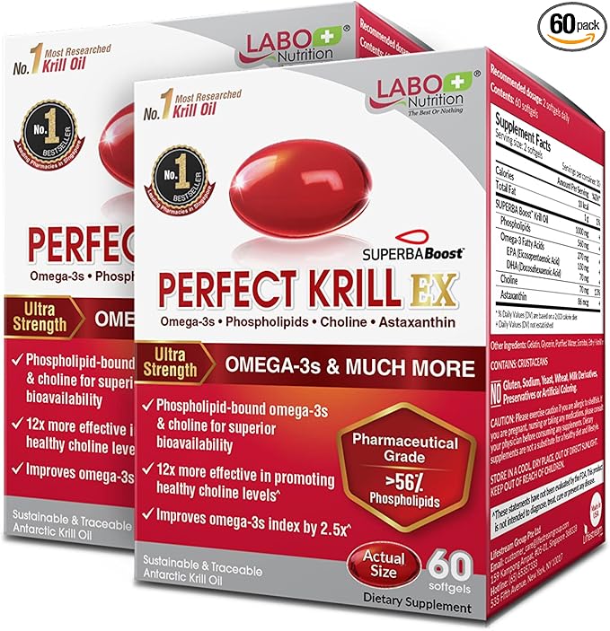 LABO Nutrition Perfect Krill EX, 1000mg Antarctic Krill Oil Omega 3 EPA DHA, Highest Phospholipids (Over 56%) with Choline, Astaxanthin | Heart Brain Eye Joint Health, Made in USA, 60 softgelsX2