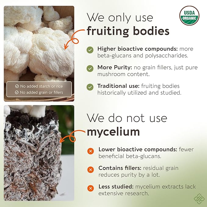 - 🌱 PURE & USDA ORGANIC CERTIFIED: Our USDA-certified Lion's Mane extract is derived exclusively from 100% fruiting body, free from grains, fillers, or additives. Experience pure, organic, and unadulterated mushrooms for superior health benefits